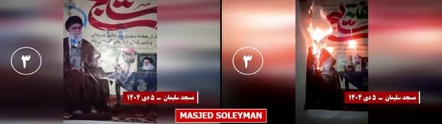 Additionally, banners, billboards, and images of regime leaders, including Khomeini, Khamenei, and Qasem Soleimani, were set on fire in Isfahan, Mashhad, Yazd, Izeh, Tehran, Damghan, Masjed Soleyman, Azna, Aligudarz, and Bandar Abbas. These actions, accompanied by slogans such as ‘Death to Khamenei’ and ‘Death to the principle of Velayat-e Faqih,’ constituted a fiery response to the religious dictatorship and a renewal of the covenant with the martyrs of the uprising.