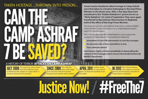 While reminding U.S. and UN of their official and written commitments with regard to the Camp Ashraf residents, the Iranian Resistance calls on them to take immediate action for the release of the seven Camp Ashraf hostages who are all protected persons under the 4th Geneva Convention, recognized as asylum-seekers and people of concern.
