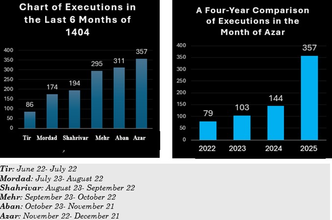 In a heinous and brutal crime, Iranian regime authorities hanged 357 prisoners, including eight women, in 64 cities across 31 provinces Since November 22. The provinces of Razavi Khorasan with 38 executions, Lorestan with 28, Khuzestan with 23, and Isfahan with 22 topped the list. Three of these victims were brutally hanged in public. The number of executions in these two months is two-and-a-half times the figure for the same period in 2024 (144 executions), three-and-a-half times that of 2023 (103 executions), and four-and-a-half times that of 2022 (79 executions).
