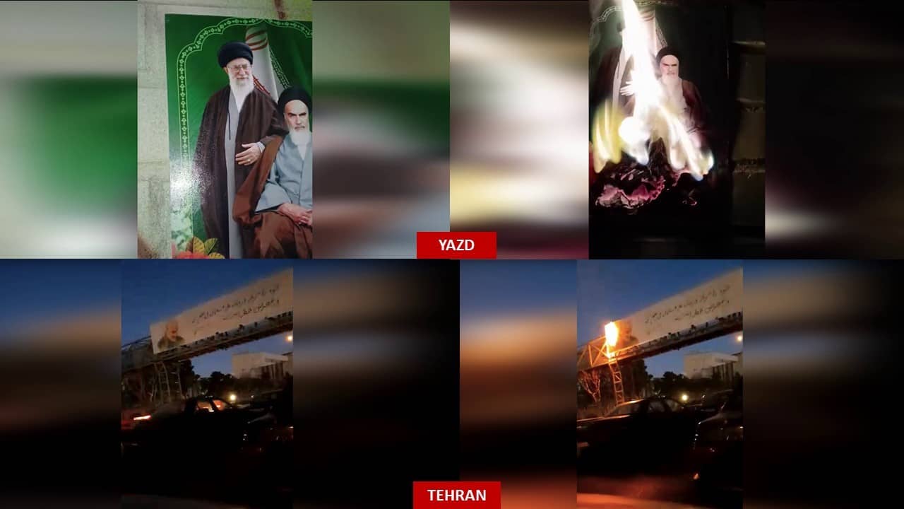 In an additional 10 operations, two banners of Qasem Soleimani on bridges over the Sayyad Shirazi Highway and the Imam Ali Highway in Tehran, a banner of Ebrahim Raisi on the Fardis Bridge in Karaj, a Qasem Soleimani billboard and another banner on the Shimiai bridge in the same city, an image of Khomeini in Masjed Soleyman, a Qasem Soleimani banner in Kerman, the signboard of the IRGC Basij intelligence center in Bojnurd, images of Khomeini and Khamenei in Yazd, and the sign of the State Security Force (SSF) in Shahr-e Kord were set ablaze.