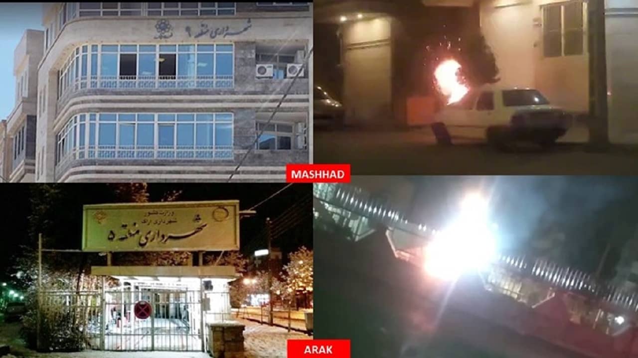 Among these bold actions, a Basij base and six other centers of repression were set ablaze in Tehran, three Basij bases in Isfahan, a suppressive SSF (State Security Force) headquarters in Bam, two centers of governmental plunder in Mashhad and Arak, a center of repression and plunder in Eslamabad-e Gharb, the Basij base of the IRGC responsible for suppressing women in Talesh, a center of repression in Homayounshahr (Isfahan), a Basij base in Najafabad, and a center of plunder and repression in Hashtgerd.