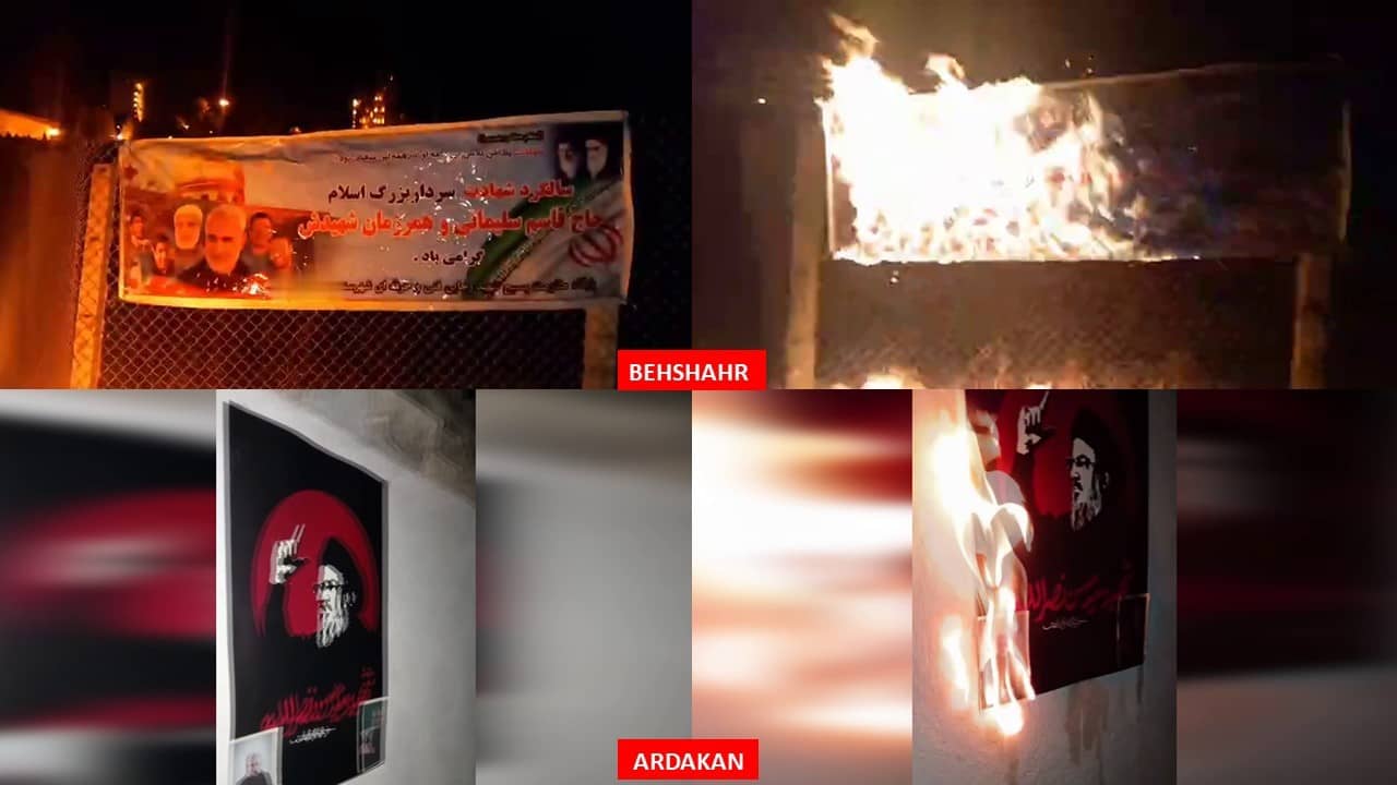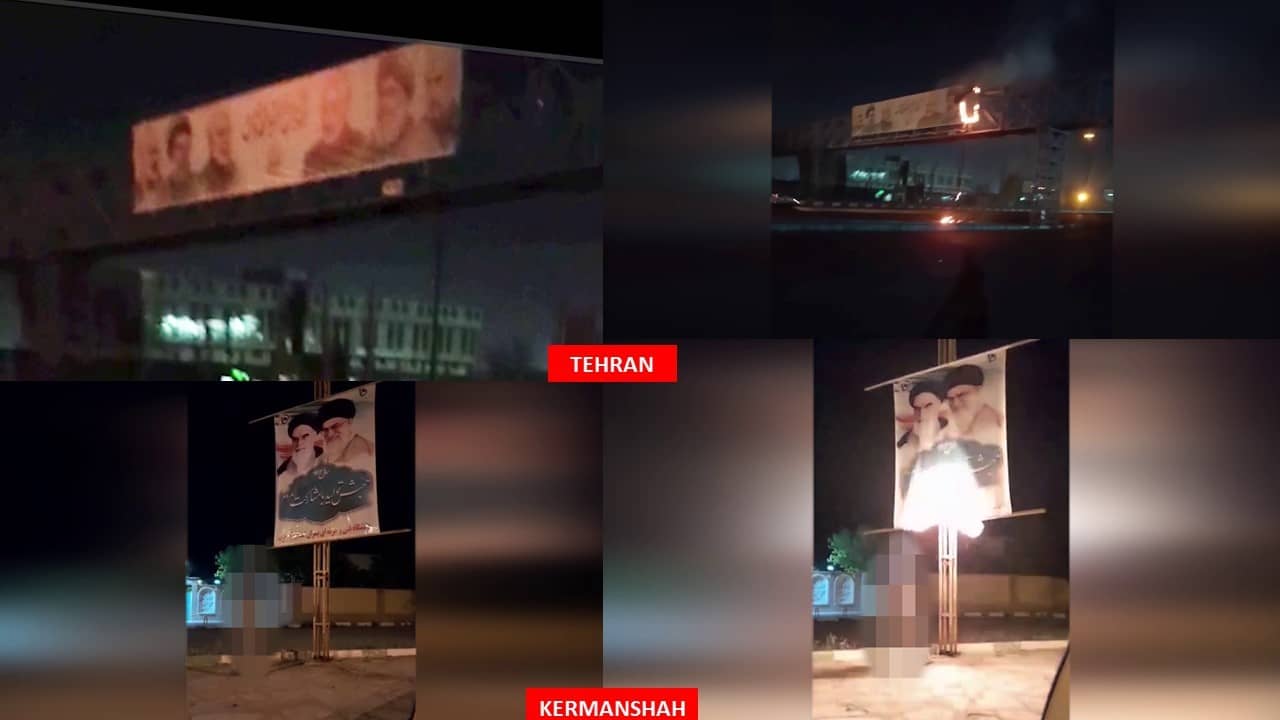 In an additional 17 operations, defiant youth set fire to images and symbols of repression and plunder belonging to the regime. These included five banners of Qassem Soleimani and other regime leaders in Tehran, three banners of Qassem Soleimani in Mashhad, and nine banners of Khomeini, Khamenei, and Qassem Soleimani in the cities of Rasht, Ardakan, Qaemshahr, Bushehr, Kermanshah, Behshahr, Kazeroon, and Borazjan.