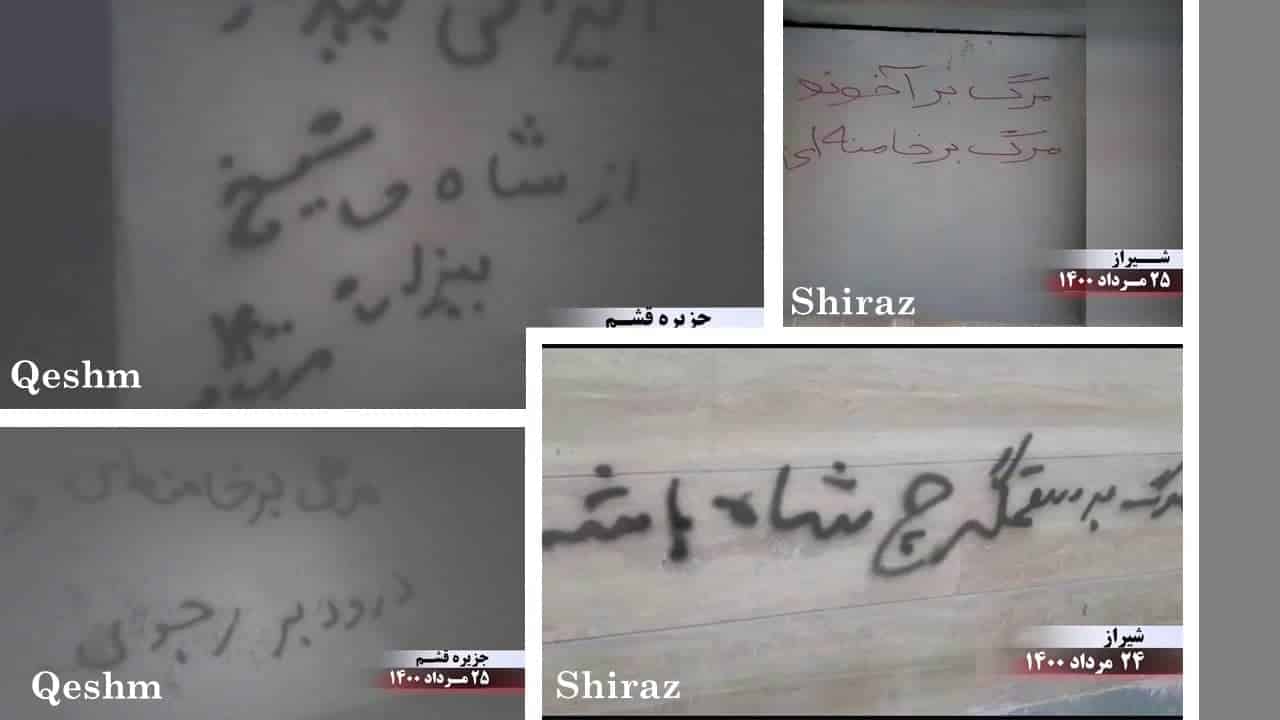 On the 15th and 16th of August 2021, the Resistance Units, and supporters of Mujahedin-e Khalq (MEK/PMOI) in various cities posted banners and placards and wrote graffiti to distribute messages of the Iranian Resistance leadership (Mrs. Maryam Rajavi, the President-elect of the National Council of Resistance of Iran (NCRI), and Mr. Massoud Rajavi, the leader of the Iranian Resistance) regarding the appointment of Ebrahim Raisi, the henchman of the 1988 massacre as the regime’s president. They also called for protest and uprising to end the mullahs’ dictatorship and establish a free and democratic Iran. The activities of MEK supporters and Resistance Units took place in Tehran, Karaj, Isfahan, Ahvaz, Kerman, Tabriz, Qazvin, Shiraz, Mashhad, Kashan, Neyshabur, Sari, Urmia, Yasuj, Qeshm Island, Minab, Bushehr, and Dezful.