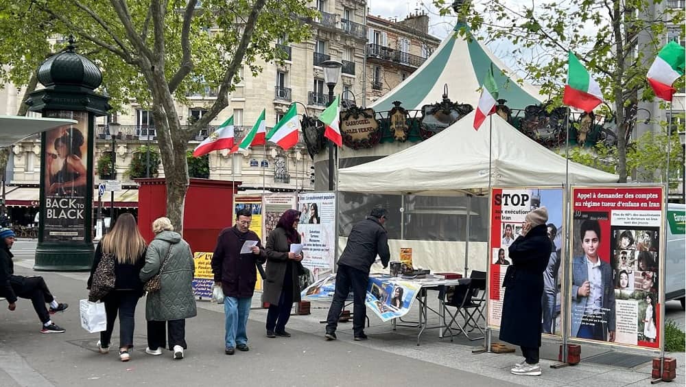 Leipzig, Germany—April 20, 2024: Freedom-loving Iranians and supporters of the People’s Mojahedin Organization of Iran (PMOI/MEK) organized an exhibition to express solidarity with the Iranian Revolution.