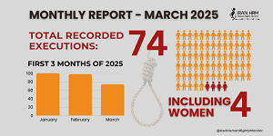 In March 2025, the Islamic Republic of Iran continued its systematic use of capital punishment at an alarming rate. According to Iran Human Rights Monitor’s findings, at least 74 individuals, including four women, were executed across the country during the month. This wave of executions coincided with the start of the Iranian New Year and the holy month of Ramadan, underscoring the regime’s persistent disregard for fundamental human rights and international appeals to end the death penalty.