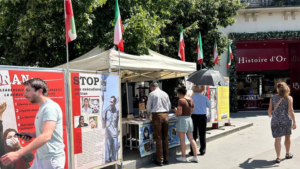 Zurich, Switzerland—July 15, 2024: Freedom-loving Iranians and supporters of the People’s Mojahedin Organization of Iran(PMOI/MEK) organized an exhibition to support the Iranian Revolution.