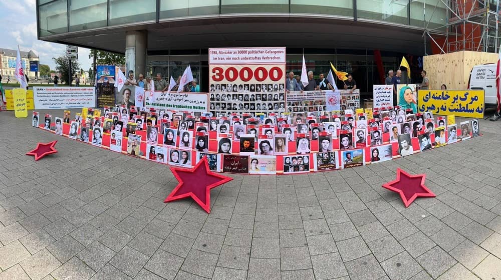 Essen, Germany—July 27, 2024: Freedom-loving Iranians and supporters of the People’s Mojahedin Organization of Iran (PMOI/MEK) organized a photo exhibition and book table to express solidarity with the Iranian Revolution. They try to convey the voice of the youth and the revolution of the Iranian people to the people of the world.