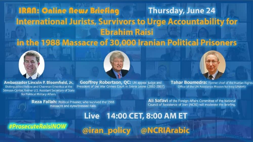 1) #Iran: Online News Briefing International Jurists, Survivors to Urge Accountability for Ebrahim Raisi in the 1988 Massacre of 30,000 Iranian Political Prisoners #ProsecuteRaisiNOW