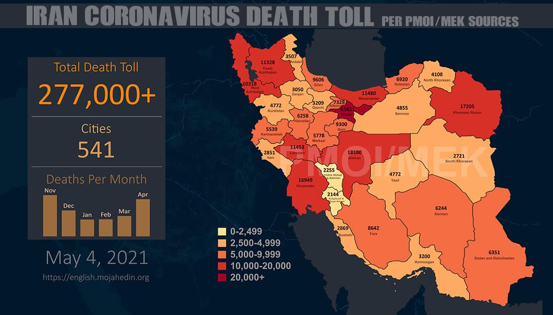 The People’s Mojahedin Organization of Iran (PMOI/MEK) announced on Tuesday, May 4, 2021, that the Coronavirus death toll in 541 cities had exceeded 277,000. The number of victims in Tehran has reached 63,821, Isfahan 18,180, Khorasan Razavi 17,205, Khuzestan 16,949, Mazandaran 11,480, East Azerbaijan 11,328, West Azerbaijan 10,318, Gilan 9,606, Qom 9,300, Fars 8,664, Alborz 7,328, Golestan 6,920, Sistan and Baluchestan 6,351, Hamedan 6,258, Kerman 6,244, Central Province 5,778, Kermanshah 5,539, North Khorasan 4,108, Ardabil 3,507, Zanjan 3,050, Ilam 2,851, and South Khorasan 2,721.