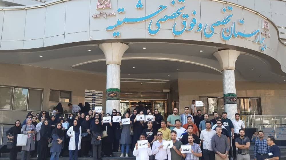 Health workers of the Medical Sciences University continue strikes and protests, demanding higher wages, changes to overtime working rules and compensation, and better working conditions.#IranProtests pic.twitter.com/Q2kNwqcP7r— People's Mojahedin Organization of Iran (PMOI/MEK) (@Mojahedineng) August 24, 2024