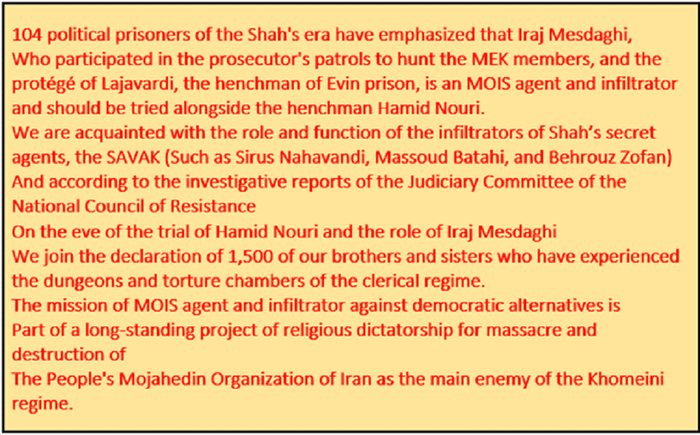 Signatories expose Iraj Mesdaghi’s role as an agent of the Iranian regime’s intelligence